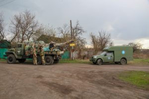 Нещодавно один такий конвой, який складався з автомобілів «Богдан 2251» та «Богдан 2351» зайшов до Лобачово та Лопаскіно. Гуманітарний вантаж – це допомога зі всієї України, бо сотні небайдужих сприйняли біль цих людей, їх горе, та страх життя на «лінії нуль», як власну долю. З різних куточків держави від Івано-Франківська до Ірпеня люди надіслали до ЦВС ОТУ «Північ» одяг, іграшки, ліки, продукти. Загалом назбиралось близько десяти тон такої допомоги. Деякі посилки навіть були адресними. Власне, щоб доставити вантаж було прийнято рішення, вперше за всю історію АТО – ООС, провести спільну гуманітарну операцію штабу ООС та ОТУ “Північ” там, куди бояться заїжджати більшість міжнародних спостерігачів, адже до ворога тут всього лічені метри а до наших військ далеко. Оскільки було попередження про можливі провокації, то було прийнято рішення включити в першу гуманітарну колону лише всюдиходи українського виробництва «Богдан», які зараз активно надходять на озброєння наших військ замість застарілих УАЗів. Також, до складу групи було включено групу медиків з мобільного госпіталю. Адже в можливостях їх нового санітарного автомобілю не лише поміряти тиск, алей зробити кардіограму, провести інші обстеження. І для цього не потрібно ні підключення до електромереж, ні будь що інше. Лише безпечне місце та кваліфікований медичний персонал.